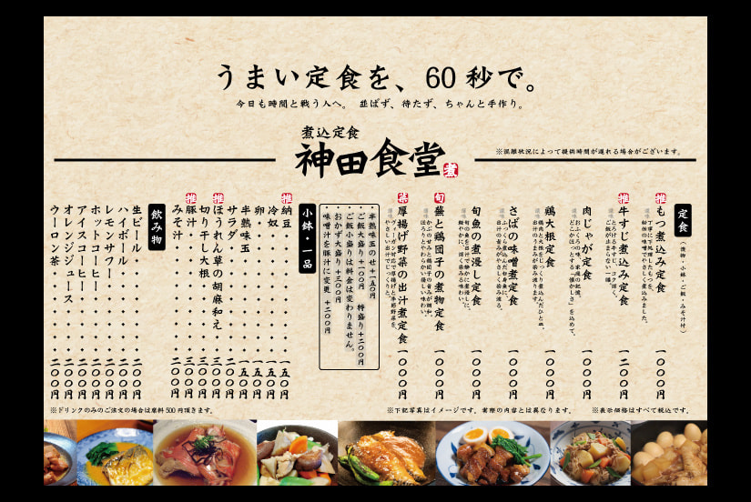 昼は煮込み定食を中心に、すぐ出て、しっかり美味い、食べ応えのある定食を提供。昼休みが短い人、待ちたくない人、でもちゃんと食べたい人のために。煮込みだからこそ、時間をかけて仕込んだ味わいを、60秒で。手間を惜しまない仕込みと、提供スピードの両立。それが神田食堂の昼ごはん。